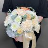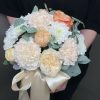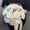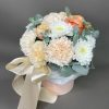 Светлый, стойкий, свежий, круглый и пушистый букетик в коробке с крупными атласными лентами. Светлые оттенки переходят друг в друга, а персиковая роза выделяется на фоне нежных цветов. Отличный подарок учителю или коллеге.
